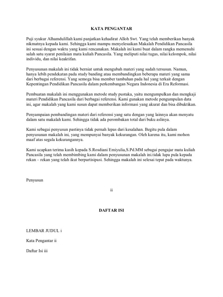 Dalam penulisan laporan atau makalah dalam lingkup tugas ilmiah, penggunaan kata pengantar laporan adalah hal yang lazim dilakukan. Kata pengantar juga sering muncul dalam berbagai karya tulis ilmiah selain makalah, seperti jurnal, tesis, skripsi, proposal dan lainnya. Berikut ini diberikan petunjuk penulisan dan contoh kata pengantar makalah dengan susunan yang benar untuk sobat pelajari. Yaitu, perhatikan panjang kata pengantar. Contoh kata pengantar makalah sejarah; Tiada kalimat yang pantas penulis ucapkan kecuali rasa syukur kepada tuhan yang maha esa atas selesainya makalah yang . Contoh kata pengantar makalah agama; Contoh kata pengantar makalah agama; Bila terlampau detil dan panjang membahas mengenai isi karya tulis,. Kumpulan contoh kata pengantar makalah, laporan pkl / kkn / kegiatan , skripsi, tugas akhir, praktikum, proposal, penelitian, karya ilmiah, singkat, buku, Berikut adalah contoh kata pengantar yang baik dan benar untuk makalah, laporan, skripsi, proposal, dll. Contoh dari kata pengantar laporan skripsi; Berikut ✓ contoh kata pengantar yang terdapat pada karya tulis, proposal, laporan, makalah, & skripsi yang baik dan benar.